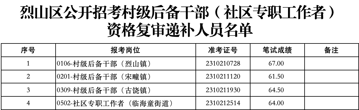 附件:烈山區(qū)公開(kāi)招考村級(jí)后備干部(社區(qū)專(zhuān)職工作者)資格復(fù)審遞補(bǔ)人員名單