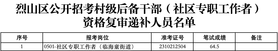 附件:烈山區(qū)公開(kāi)招考村級(jí)后備干部(社區(qū)專(zhuān)職工作者)資格復(fù)審遞補(bǔ)人員名單