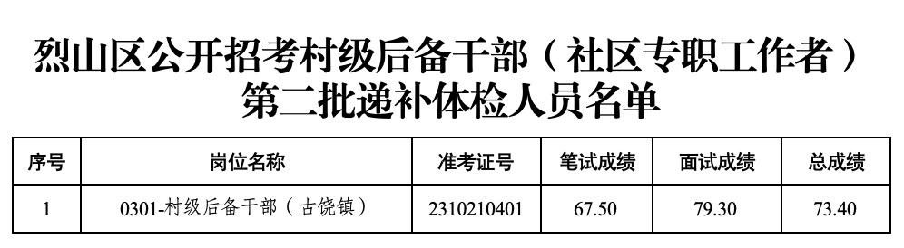 根據《烈山區公開招考村級后備干部(社區專職工作者)公告》相關規定,因0301-村級后備干部(古饒鎮)崗位遞補人員(準考證號:2310211604)自愿放棄遞補體檢資格,現將烈山區公開招考村級后備干部(社區專職工作者)第二批遞補體檢有關事項公告如下: